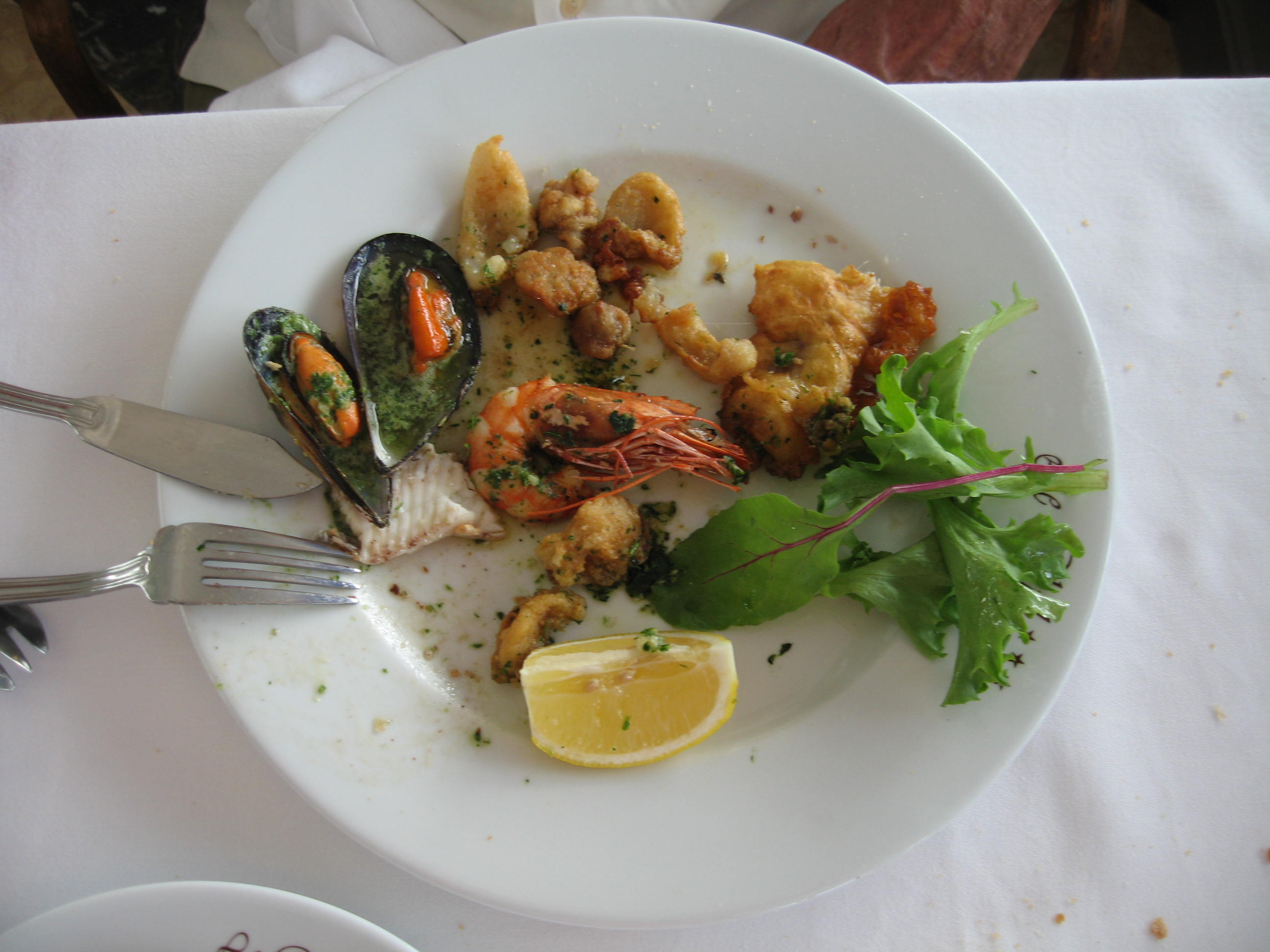 It was noon and we were both hungry.  Gene drove to a pretty restaurant on the water called Ruhl.  Seafood is their specialty as well as their service and views.  I took pictures of the Sole Meuniere, my dish, and the Misto Fritto, Gene’s.  I couldn’t resist the chocolate mousse for dessert.  We had our Rose wine from Cassis, delicieuse.  I took some pictures to share with you.