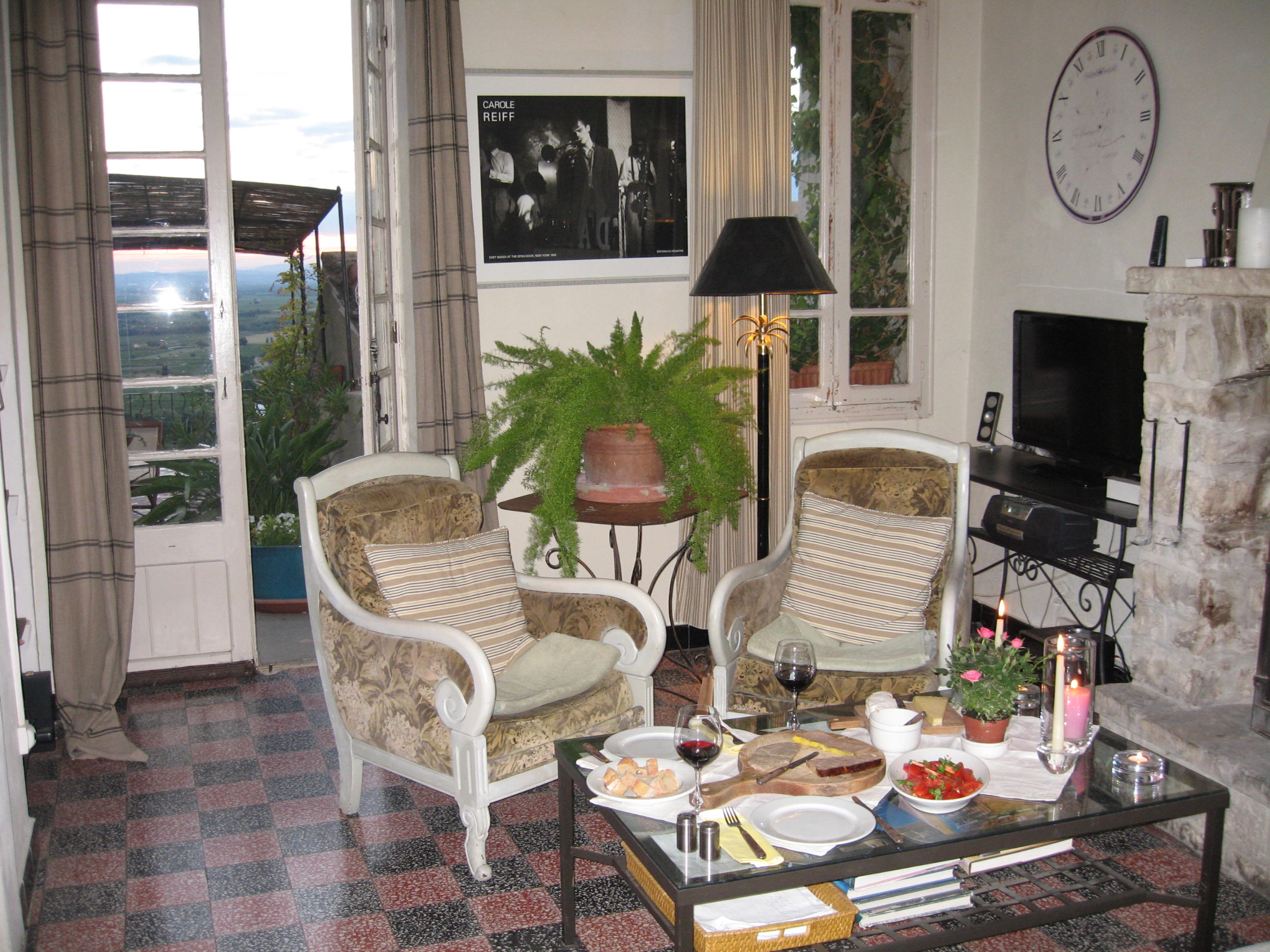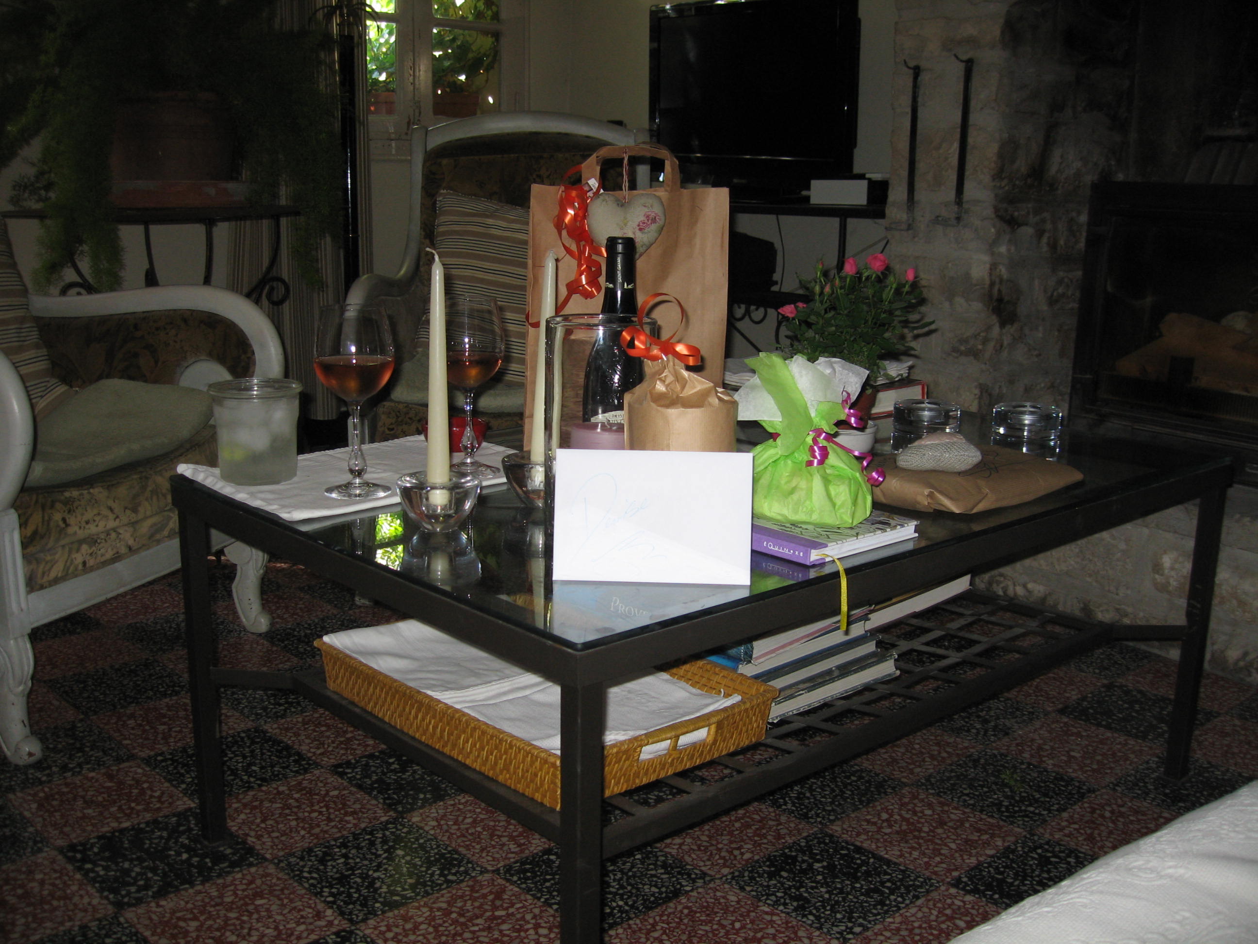 Then we got hungry again.  This time setting the table in front of the fireplace, we had wine (Gigondas), cheese, foie gras, tomatoes, and crusty bread.   Ahhh! What’s better than that?  A perfect ending to a perfect day.  Well, almost, but do you really think I’m going to write about that (maybe after a few more wines)?