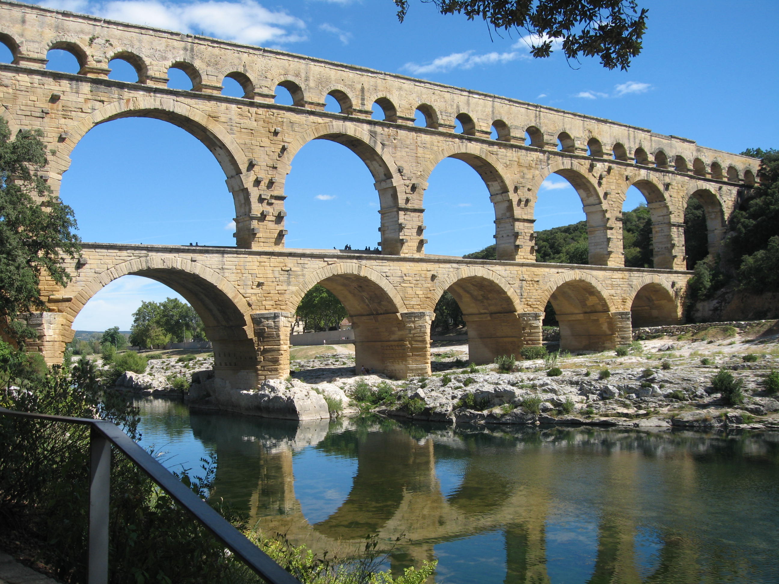 We continued to Uzes and arrived at the Pont du Gard to find out that there was no admission fee today. We saved 20 euros. We walked by a little touristy shopping and eating area with museum, and went straight to the aqueduct which had a river running under it being used for several water activities including bathing and swimming. We sat on the banks for 45 minutes and walked to the exit where I picked up a flyer with information on the famous Pont du Gard.